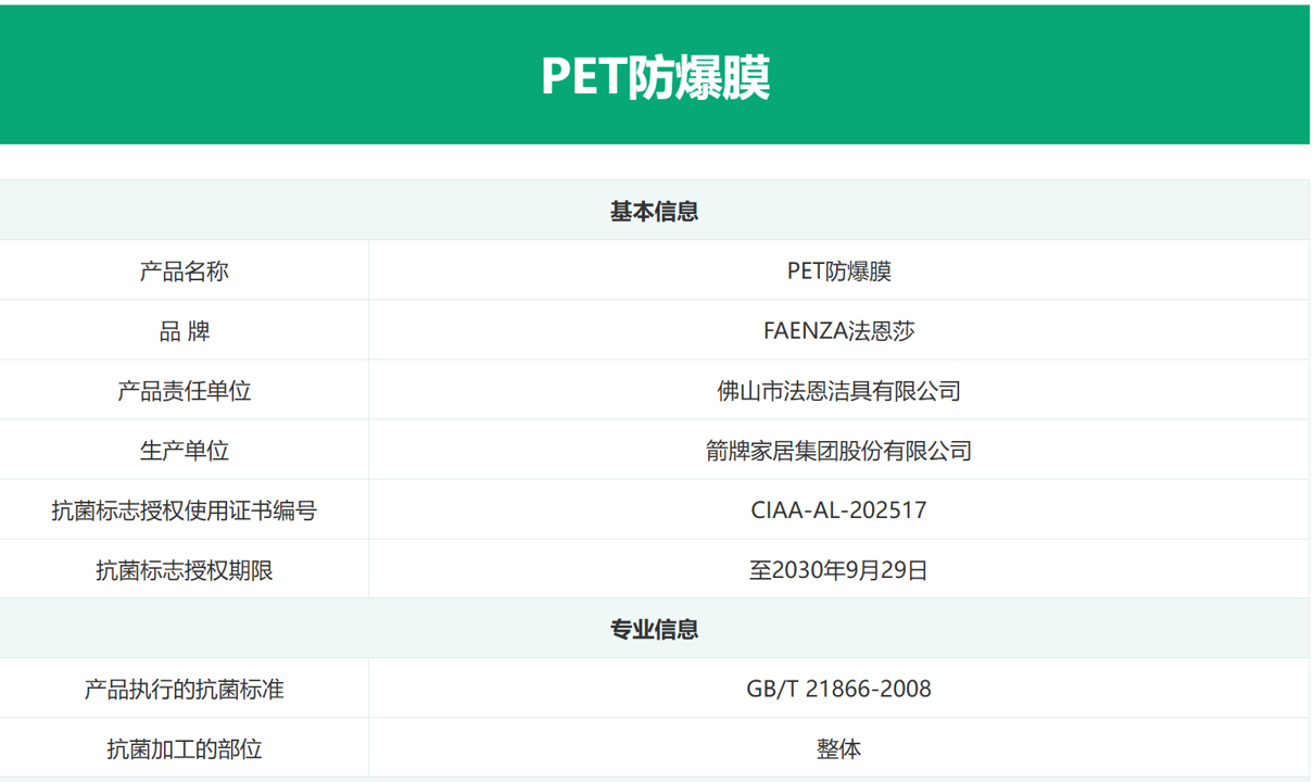 日前,箭牌家具集團(tuán)股份有限公司旗下箭牌、安華和法恩莎品牌PET防爆膜,通過(guò)CIAA的嚴(yán)苛審核,同時(shí)獲得抗菌標(biāo)志使用授權(quán)。01 抗菌標(biāo)志:代